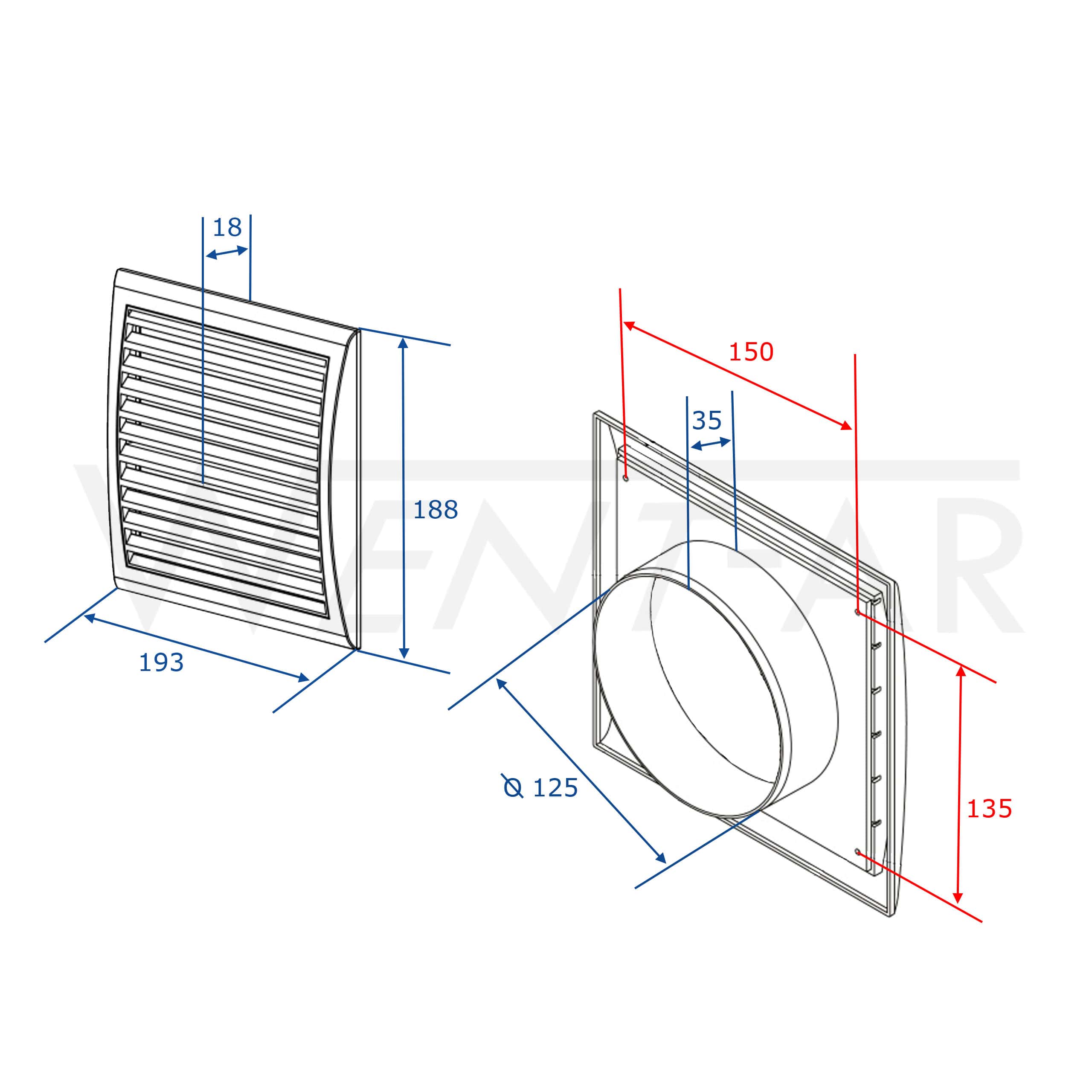Kratka wentylacyjna - 193x188 mm z siatką i kołnierzem Ø 125 mm - MW123/125K