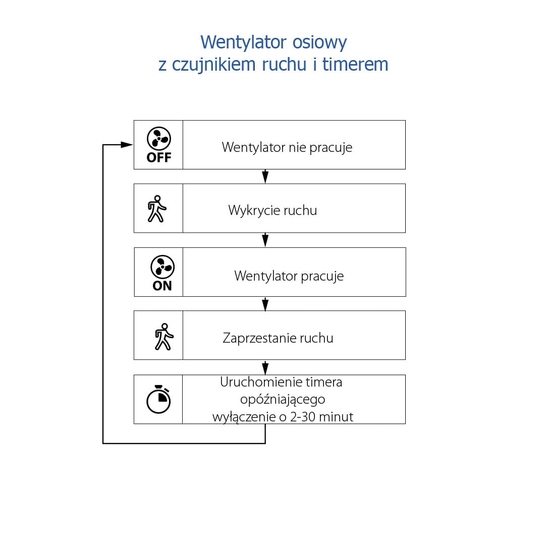 Uruchomienie wentylatora następuje w momencie wykrycia ruchu osoby w pomieszczeniu.