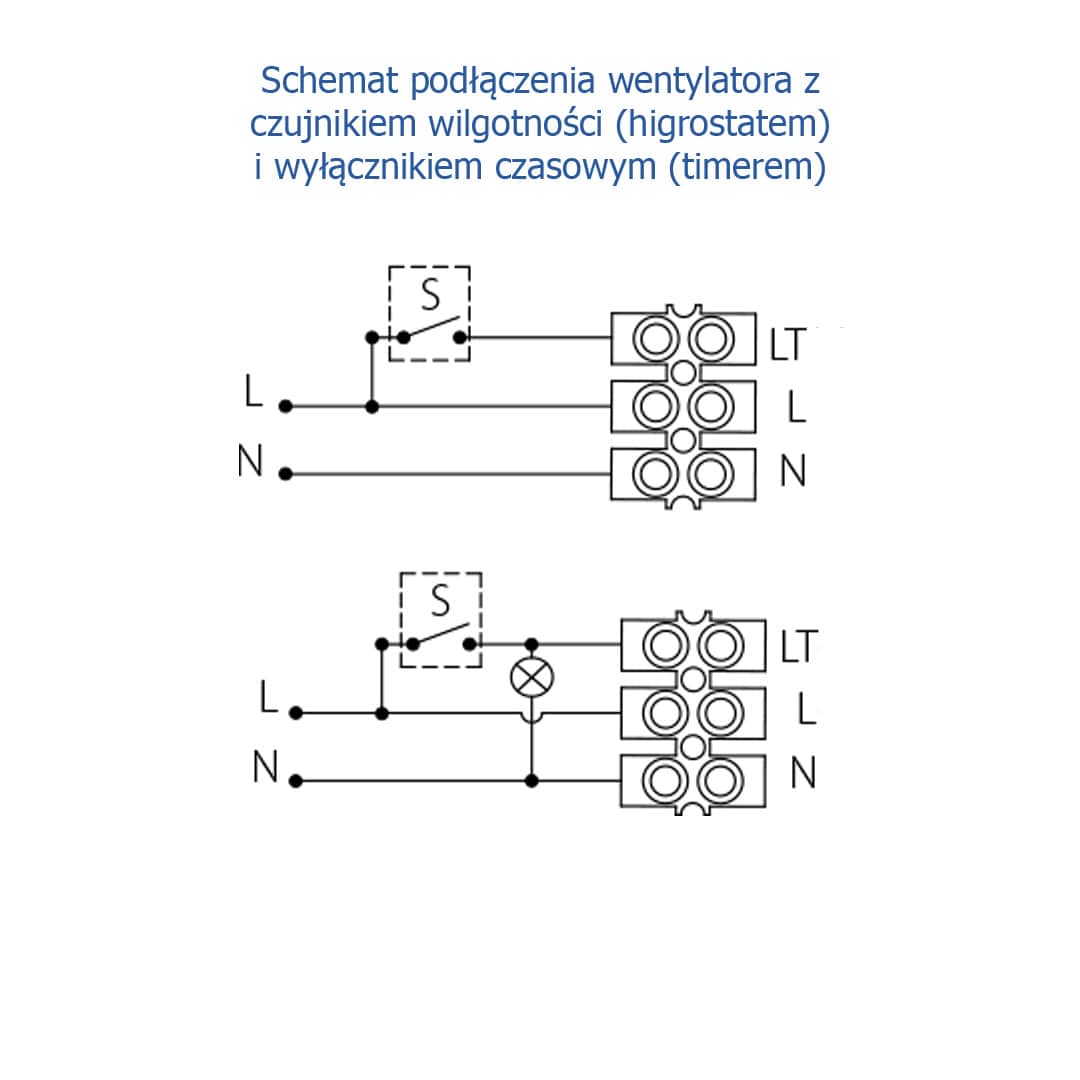 Przewód fazowy (z napięciem) należy podłączyć do zacisku na układzie elektronicznym wentylatora opatrzonego literą L. Przewód zerowy należy podłączyć do zacisku na układzie elektronicznym wentylatora opatrzonego literą N. Do zacisku na układzie elektronicznym wentylatora opatrzonego literą LT podłączamy również przewód fazowy ten sam co do zacisku L, ale poprowadzony przez włącznik światła, który będzie uruchamiał wentylator. Jest to tak zwana faza uruchamiająca dająca impuls wentylatorowi do włączenia się.