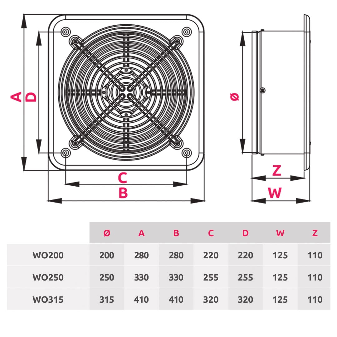 Wentylatory osiowe serii WO dedykowane są do wentylacji dużych pomieszczeń gospodarczych, lokali handlowych, garażów, pomieszczeń małej gastronomii, itp., w których zachodzi potrzeba większej wymiany powietrza. Mogą być montowane w kanałach wentylacyjnych oraz bezpośrednio w ścianach jako wentylatory wyciągowe. Dzięki zastosowaniu silników 3-biegowych, istnieje możliwość dopasowania parametrów wentylatora do potrzeb użytkownika, zależnie od sposobu podłączenia.
